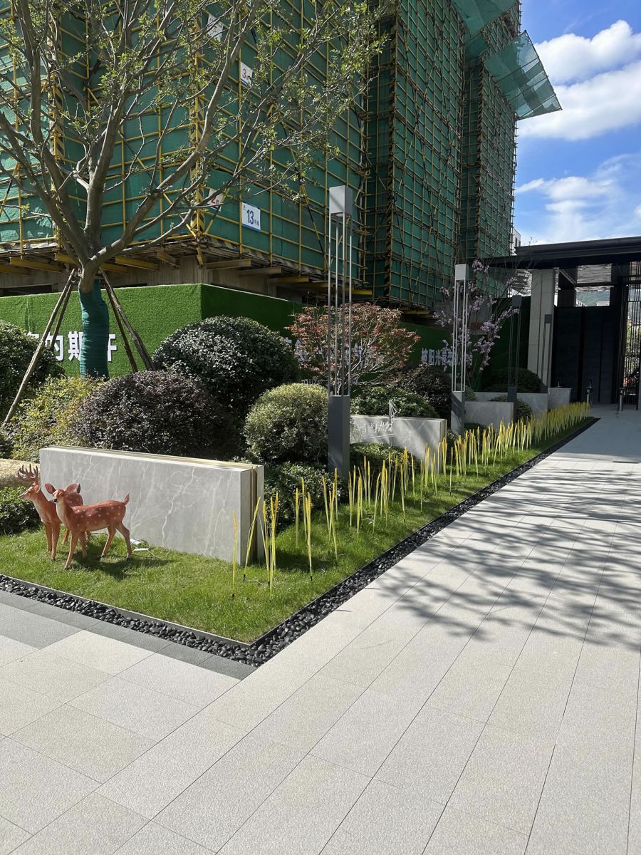 項目位于浙江麗水市,建筑面積18萬平方米。 小區景墻使用600*1200希臘淺灰干掛施工, 園林地鋪使用300*900芝麻灰鋪貼。 整體效果色澤均勻,整潔大氣。
