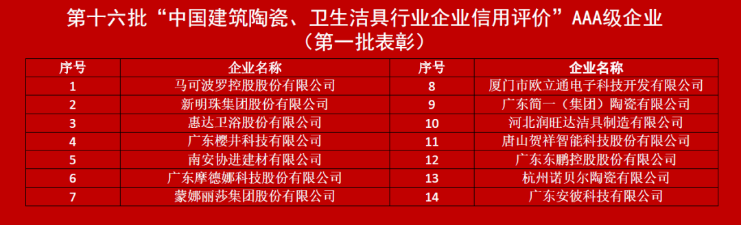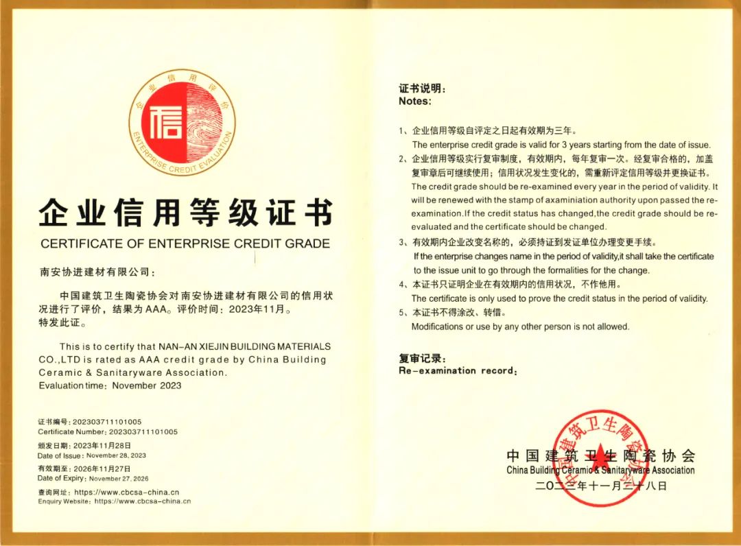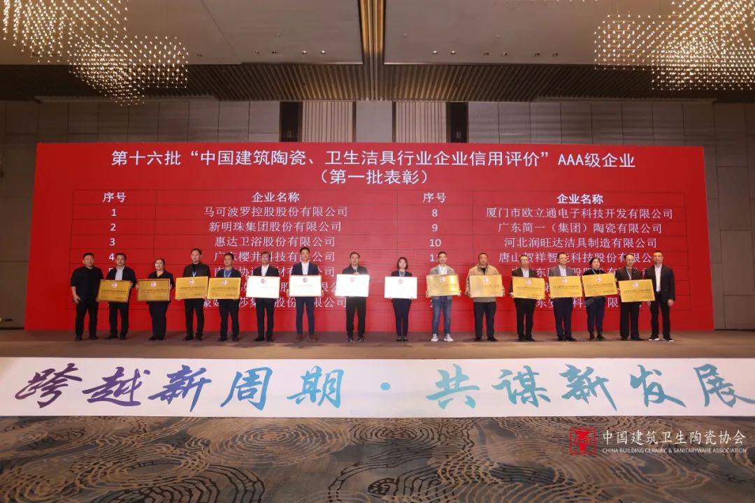 近日,中國建筑衛生陶瓷協會2023年年會在南昌舉行。會上,為建陶行業第十六批誠信企業授牌,南安協進建材有限公司連續第六次獲評為中國建筑陶瓷與衛生潔具行業AAA級信用企業。